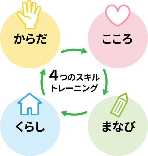 家庭生活、園での集団生活、その後の学校生活など、成長段階に応じて必要なスキルは変化します。お子さまの発達状況を見極め、「よりよい暮らし」につながるスキルを一つずつ習得していきます。
